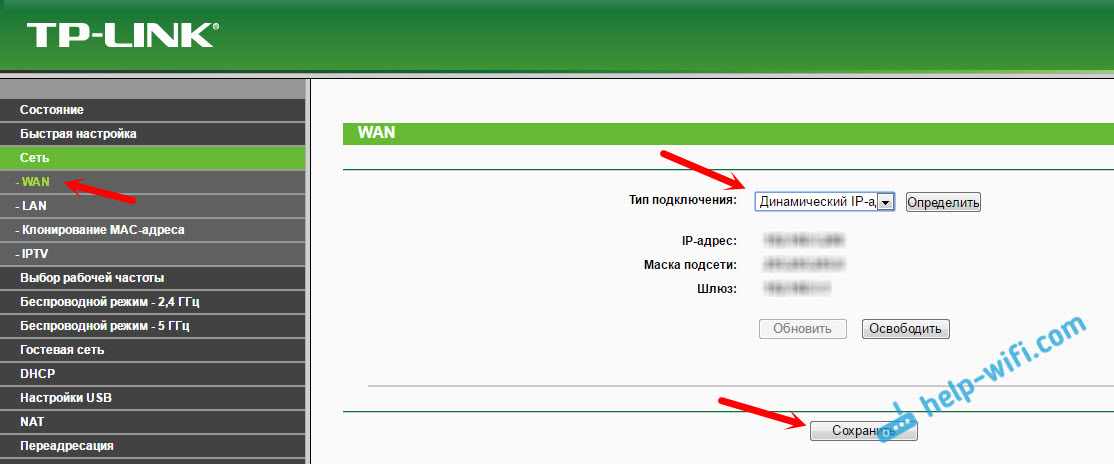 В настройках перейдите на вкладку ‘Сеть’ – ‘WAN’. Здесь, первым делом нужно выбрать тип подключения. У меня, например, Динамический IP. Если у вас такой же способ подключения, то выбирать ничего не нужно, он установлен по умолчанию. И интернет через роутер уже должен работать, а индикатор на роутере должен гореть синим, а не оранжевым. Единственный момент, если у вас ‘Динамический IP’, то провайдер может делать привязку по MAC-адресу. Если роутер не подключаться к интернету, то уточните этот вопрос у провайдера.