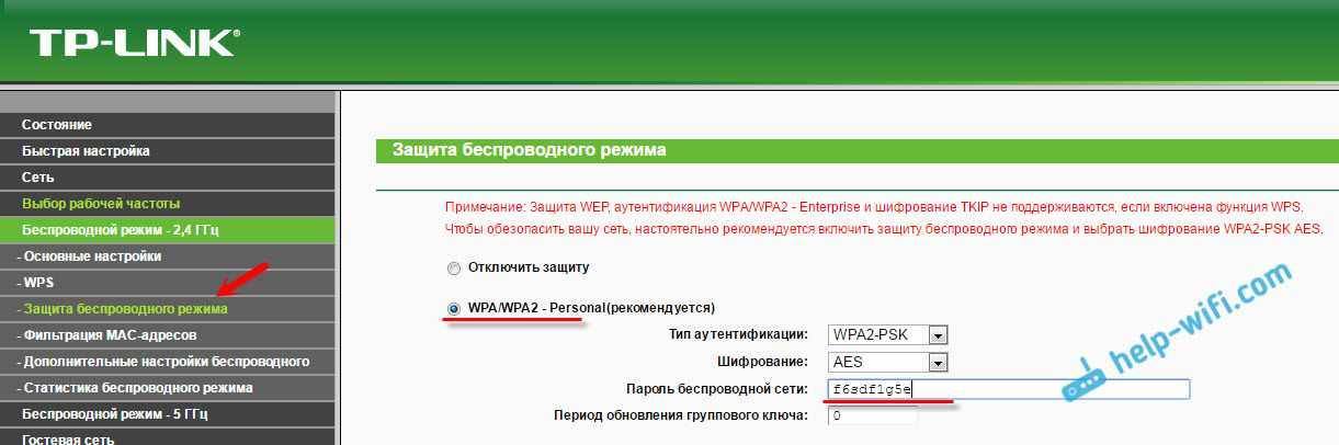 Не забудьте сохранить настройки. Следующий шаг – установка пароля на Wi-Fi сеть. Перейдите на вкладку ‘Защита беспроводного режима’. Выставьте параметры как на скриншоте ниже, и в поле ‘Пароль беспроводной сети’ задайте пароль, который будет использоваться для подключения к вашей сети. Сохраните настройки, и перезагрузите роутер.