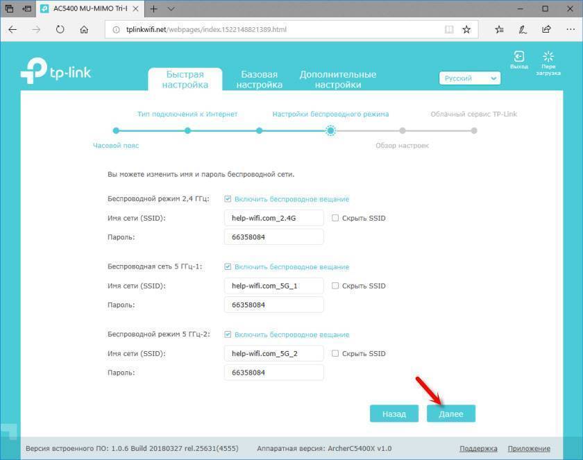 Настройка Wi-Fi сети. Тут все просто. Меняем имя каждой Wi-Fi сети (одна сеть в диапазоне 2.4 ГГц и две сети в диапазоне 5 ГГц). Ставим пароль на Wi-Fi сеть. Можно одинаковый для всех сетей. Можно отключить определенную сеть (убрав галочку возле “Включить беспроводное вещание”), если это необходимо.