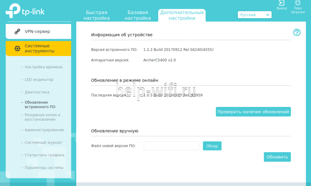 Информация о текущей прошивке и функции ее обновления находятся в блоке «системные инструменты» на странице «Обновление встроенного ПО». По традиции ТР-Link здесь предлагает две функции — проверить, есть ли новая прошивка, или обновить существующую.