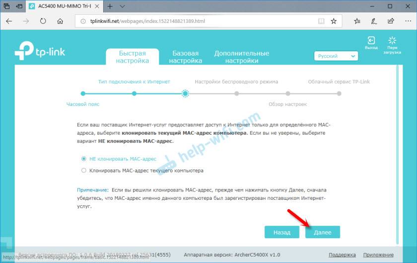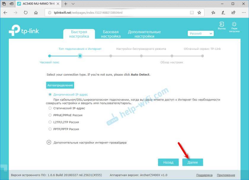 У меня тип подключения Динамический IP. Но это не значит, что у вас такой же. Если не знаете, то нужно смотреть документы, которые вам выдал провайдер, смотреть инструкции на сайте провайдера, или звонить в поддержку. Если у вас PPPoE, L2TP или PPTP, то на следующей странице нужно указать имя пользователя и пароль (для L2TP и PPTP еще и адрес сервера). Все эти параметры выдает провайдер.