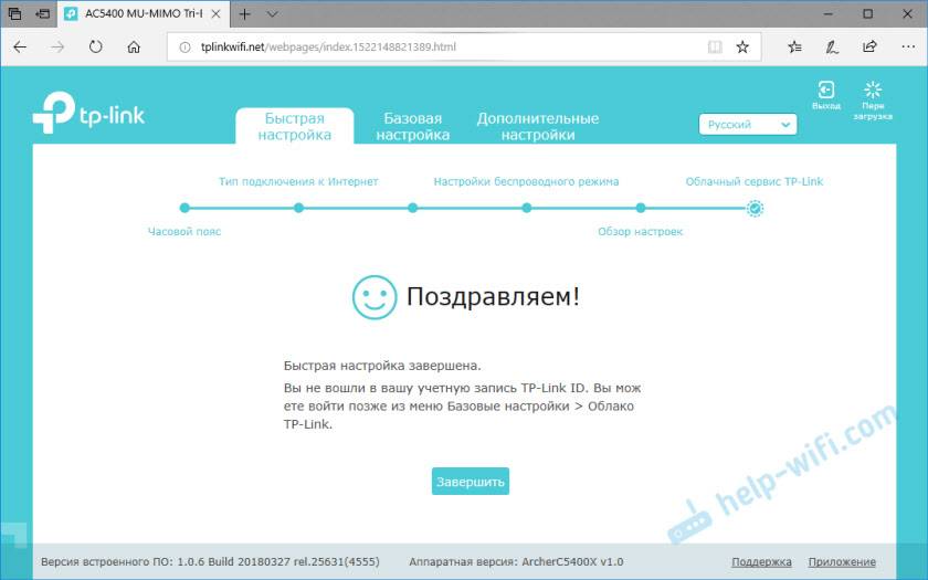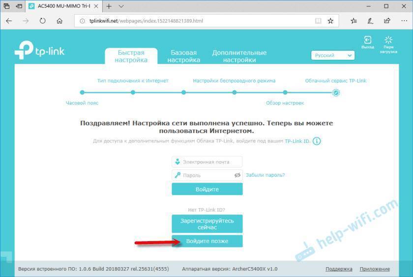 Роутер должен сообщить, что настройка сети выполнена успешно. Появится предложение зайти под TP-Link ID. Если не хотите это делать, то можно пропустить этот шаг.