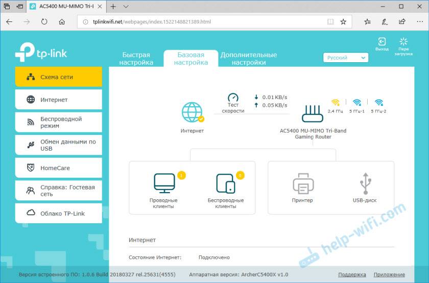 После нажатия на кнопку “Завершить” откроется “Схема сети”. Там отображается состояние сети, информация о подключенных клиентах, подключенные USB-устройства и т. д. Если статус “Состояние Интернет: Подключено”, значит все хорошо. Если же подключения нет, то слева, на вкладке “Интернет” вы можете проверить параметры подключения к интернет-провайдеру.