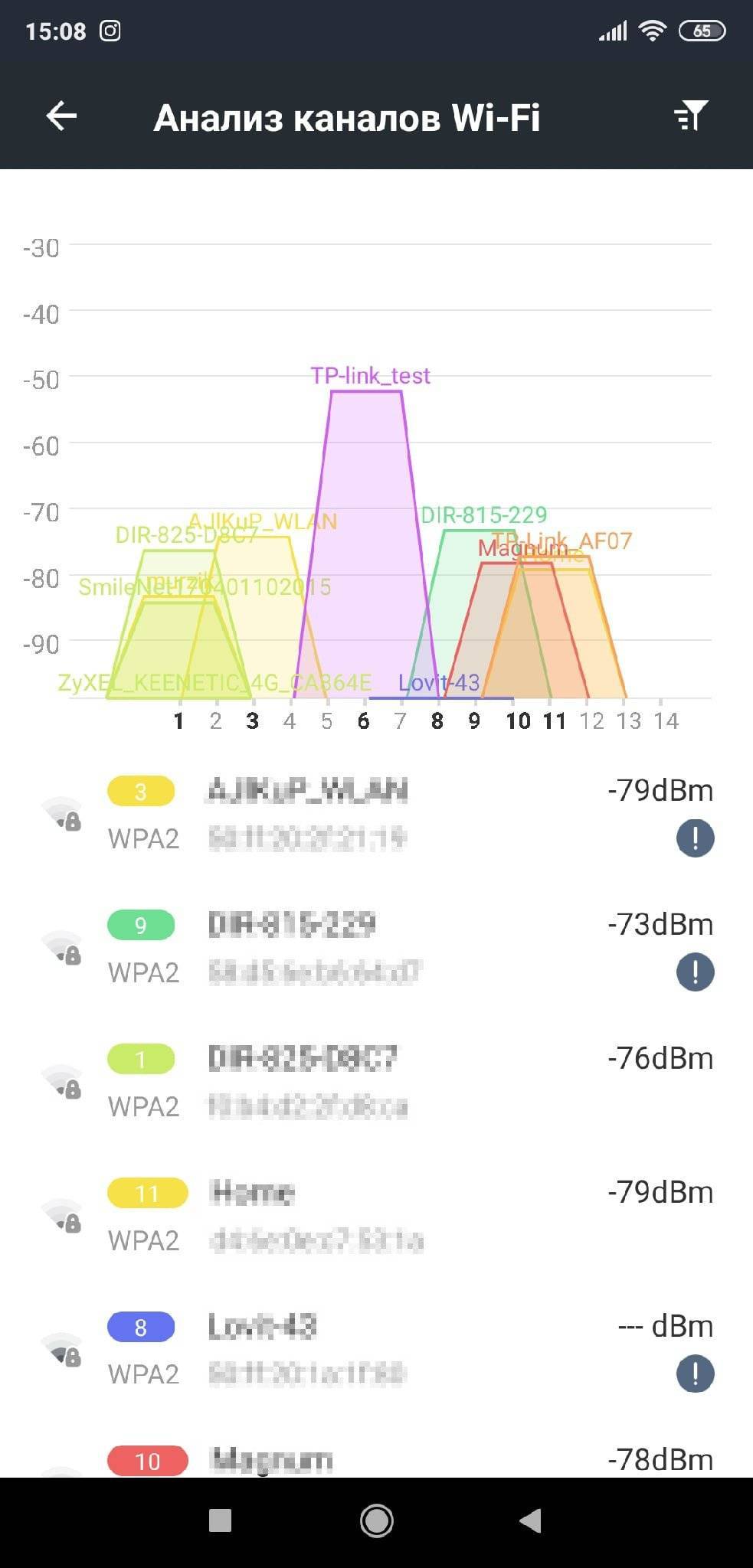 Первый тест – уровень Wi-Fi сигнала от маршрутизатора в дальней части квартиры для оценки зоны покрытия со смартфона Xiaomi Mi 8. Уровень сигнала составляет следующие значения (меньше-лучше):