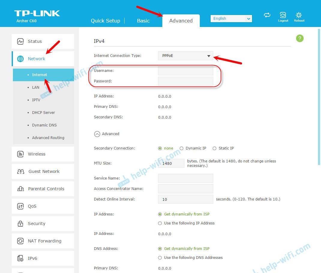 Если же интернет через роутер не работает (без доступа к интернету, или ограничено), то нужно задать параметры для подключения к провайдеру. Для этого перейдите на вкладку “Advanced” – “Network” – “Internet”.