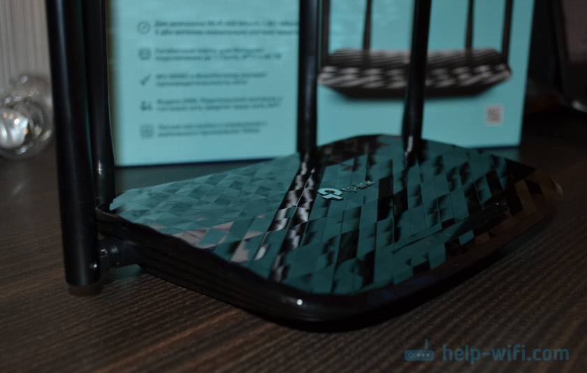 Сам роутер Archer A6 v2 имеет традиционную для многих моделей TP-Link форму с чешуйчатой верхней панелью. Однако здесь она сделана более «богато» — поверхность глянцевая и красиво играет на свету. Также логотип компании покрыт серым металликом и выступает над поверхностью, что смотрится намного дороже, чем просто краска.