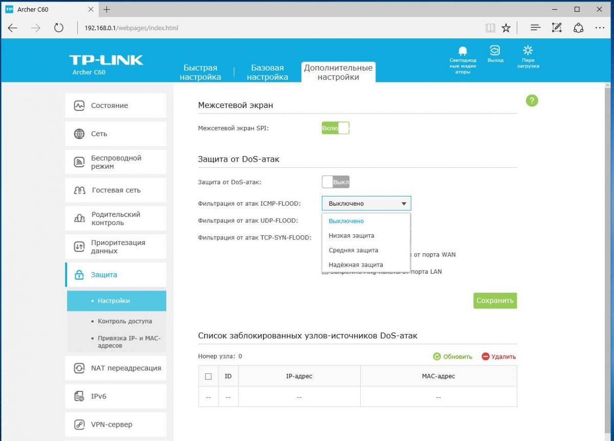 Примечательно, что в разделе «Дополнительные настройки» имеется функция защиты от DoS-атак и блокировки узлов-источников.