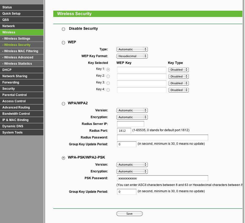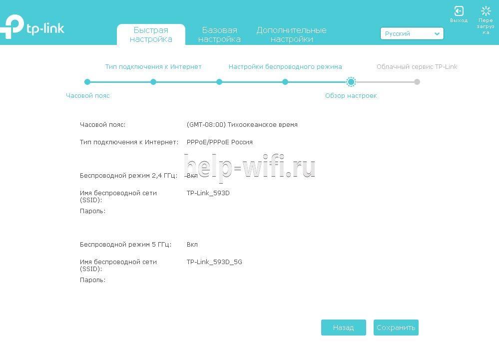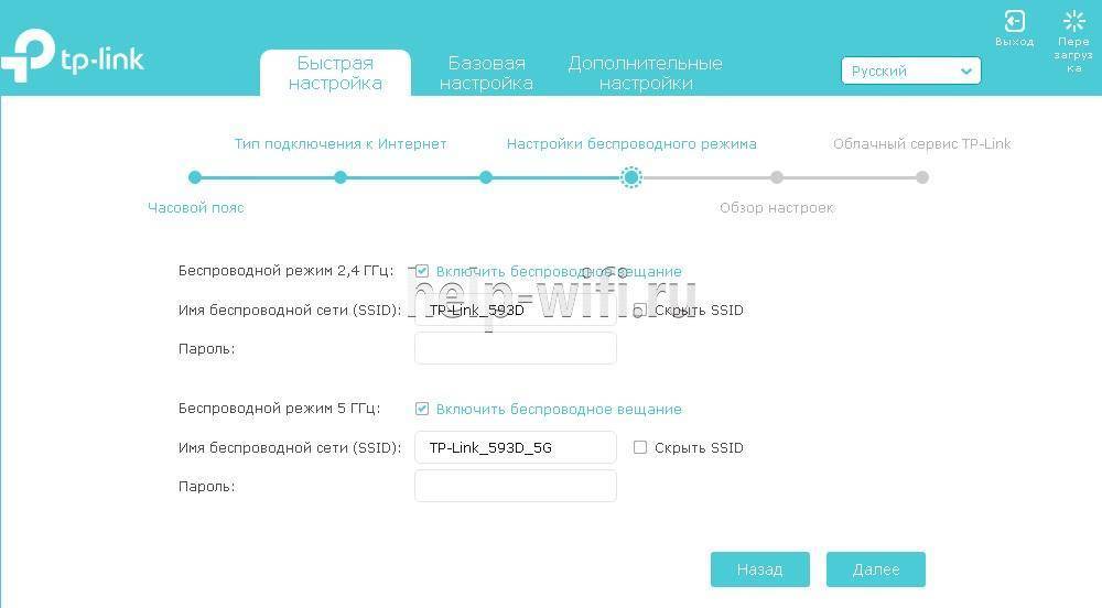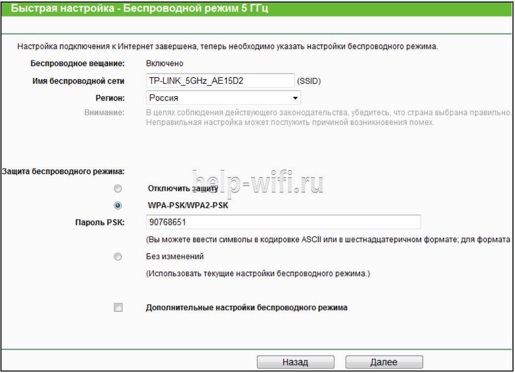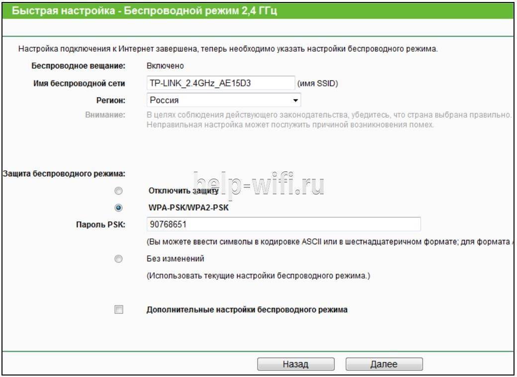 в новом окне настраиваются параметры работы Wi-Fi сети в диапазоне 2,4 ГГц. По умолчанию SSID установлен TP-LINK_2.4GHz_XXXXXX, пароль тот же, что и PIN-код на этикетке, расположенной внизу роутера;