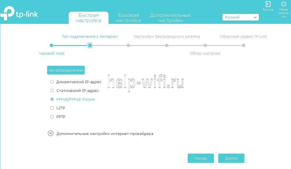 В Wi-Fi роутере TP-LINK Archer C7 настройка данного типа подключения по большому счету не отличается от вышеописанных. Она так же, как и в первых двух случаях, осуществляется во вкладке «Сеть». Единственным отличием будет тип протокола. Из выпадающего списка необходимо выбрать «PPPOE/PPPOE Россия». Если запросит данные имя пользователя и пароля, то ввести их.