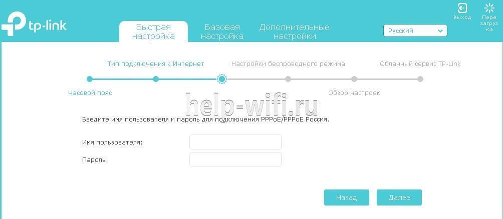 если был выбран самый распространенный тип подключения «РРРоЕ/РРРоЕ Россия», потребуется ввести логин и ключ доступа, предоставленные провайдером;