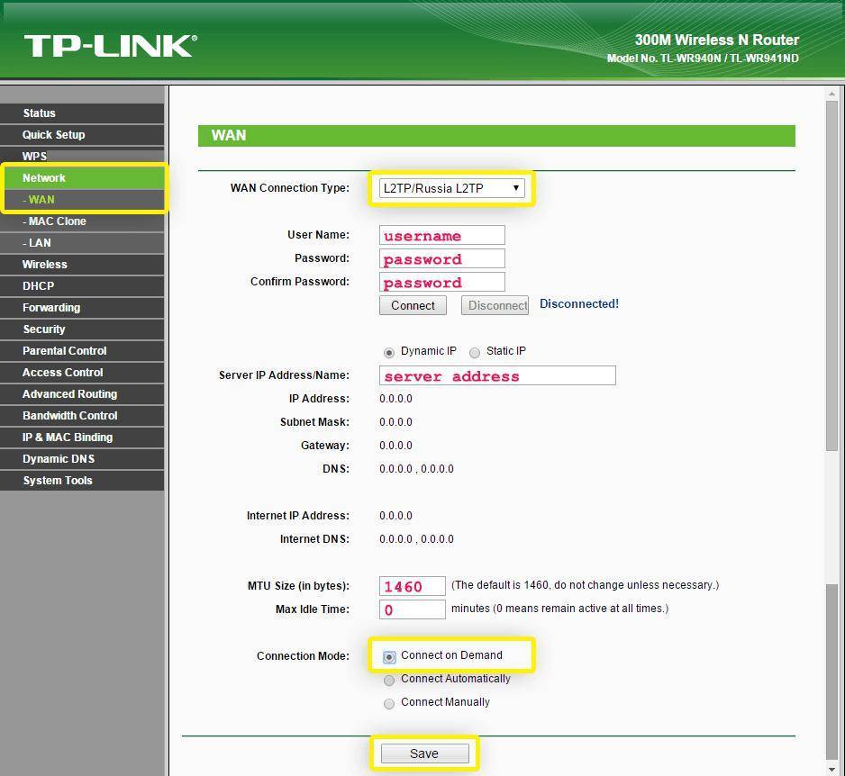 Теперь давайте рассмотрим, как осуществить настройку роутера TP-LINK Archer C7 с типом подключения L2TP. Как и в первом случае, необходимо в меню выбрать пункт «Сеть». Далее перейти во вкладку в WAN. В строке «Тип подключения» надо выбрать соответствующий протокол. Для Российской Федерации это будет «L2T/L2T Россия». После нужно ввести логин (в договорах именуется, как имя пользователя) и пароль. Также для данного типа подключения обязательно указывается IP-адрес сервера, который используется поставщиком услуг. Данные о логине и пароле можно посмотреть в договоре.
