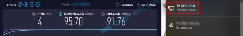 Я подключил кабель от адаптера к ноутбуку, чтобы проверить скорость соединения. К сожалению, у меня подключение к интернету до 100 Мбит/с, поэтому я не смогу продемонстрировать все возможности этих гигабитных адаптеров. Но при подключении через TL-PA7017 ноутбук выдал почти 100 Мбит/с, как и при подключении напрямую к маршрутизатору.