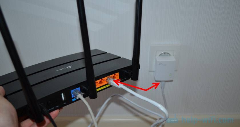 Не подключайте его через сетевые фильтры. Затем, берем сетевой кабель, подключаем его к адаптеру и в LAN разъем роутера (модема). Вот так: