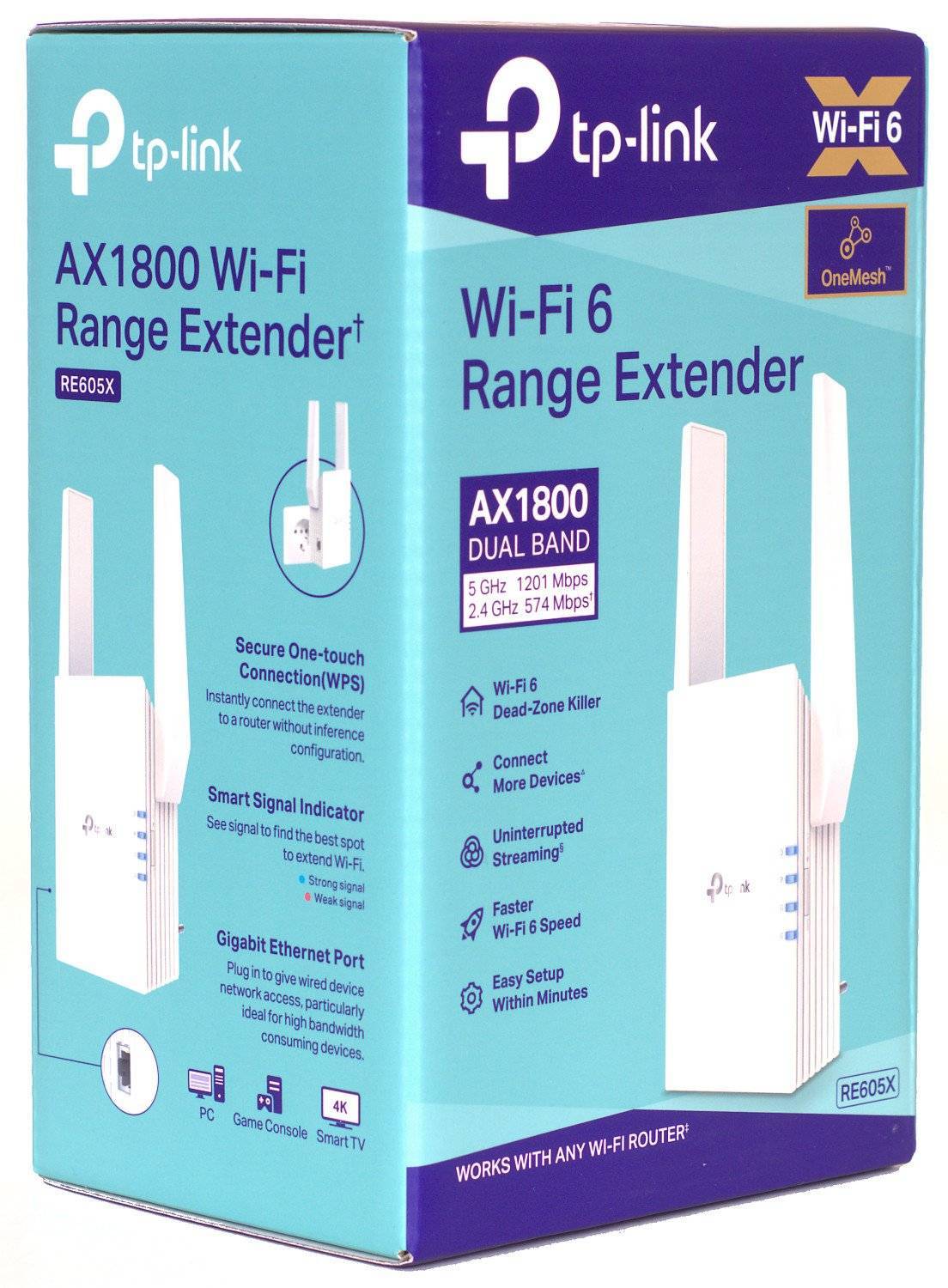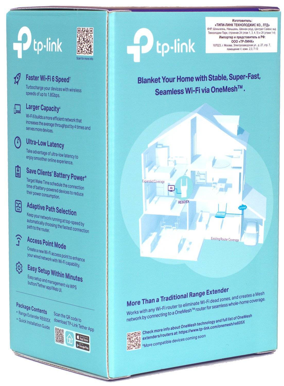 Внешнее оформление коробки с усилителем сигнала Wi-Fi 6 TP-Link RE605X сразу же дает понять о его возможностях: он двухдиапазонный и обеспечивает высокие скорости соединения (для частоты 2.4 ГГц 574 Мбит/сек и для 5 ГГц 1201 МГц), поддерживает проводное подключение (есть гигабитный LAN порт), обеспечивает простую настройку (в том числе и простое подключение через кнопку WPS), поддержку технологии бесшовного соединения OneMesh, может работать с любыми Wi-Fi роутерами, а так же выступать в качестве точки доступа.