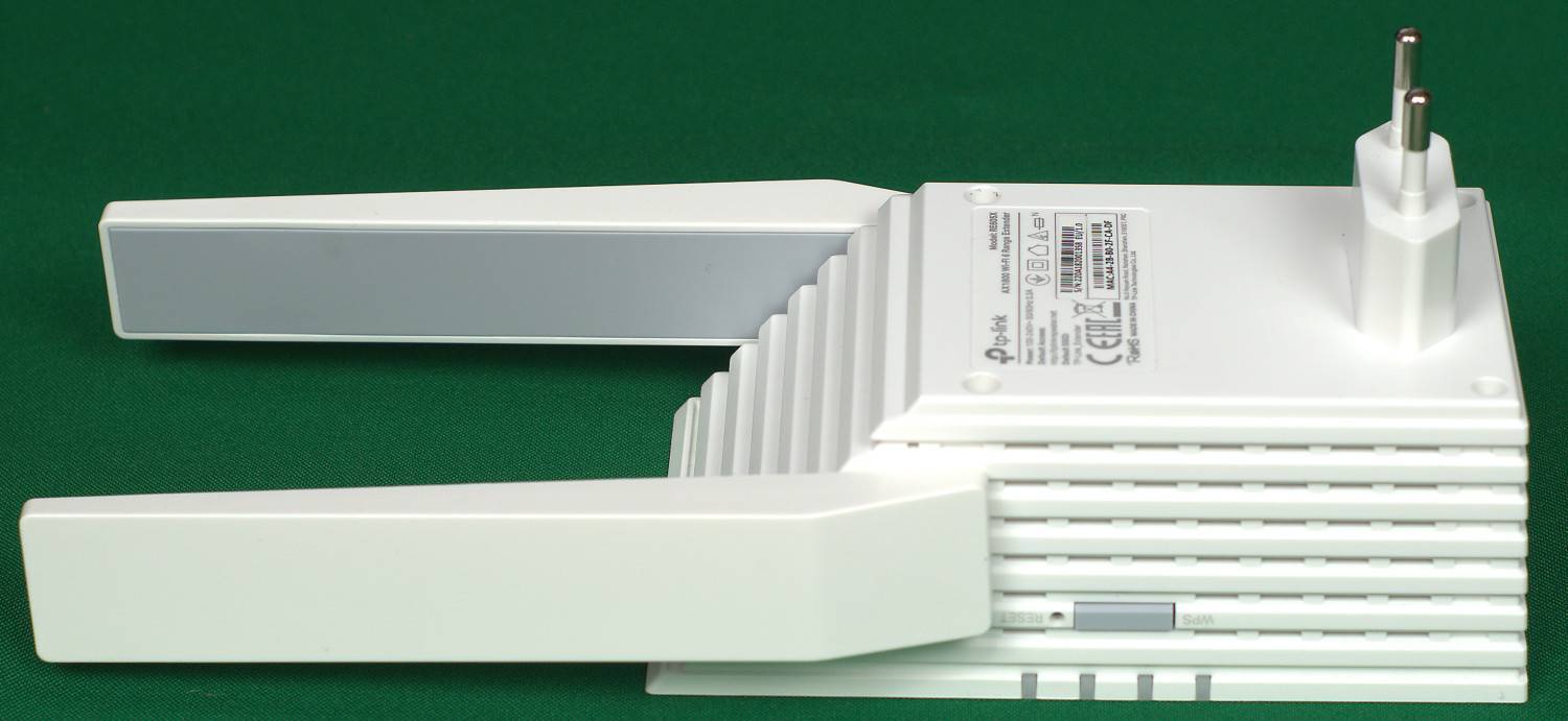 Усилитель сигнала Wi-Fi 6 TP-Link RE605X выполнен в белом пластиковом корпусе с множественной перфорацией и с двумя внешними антеннами. В итоге сам блок получился достаточно крупным (однозначно будет блокировать соседние розетки питания). Его размеры составляют 74,0 мм × 46 мм × 124,8 мм (ширина х длина х высота).
