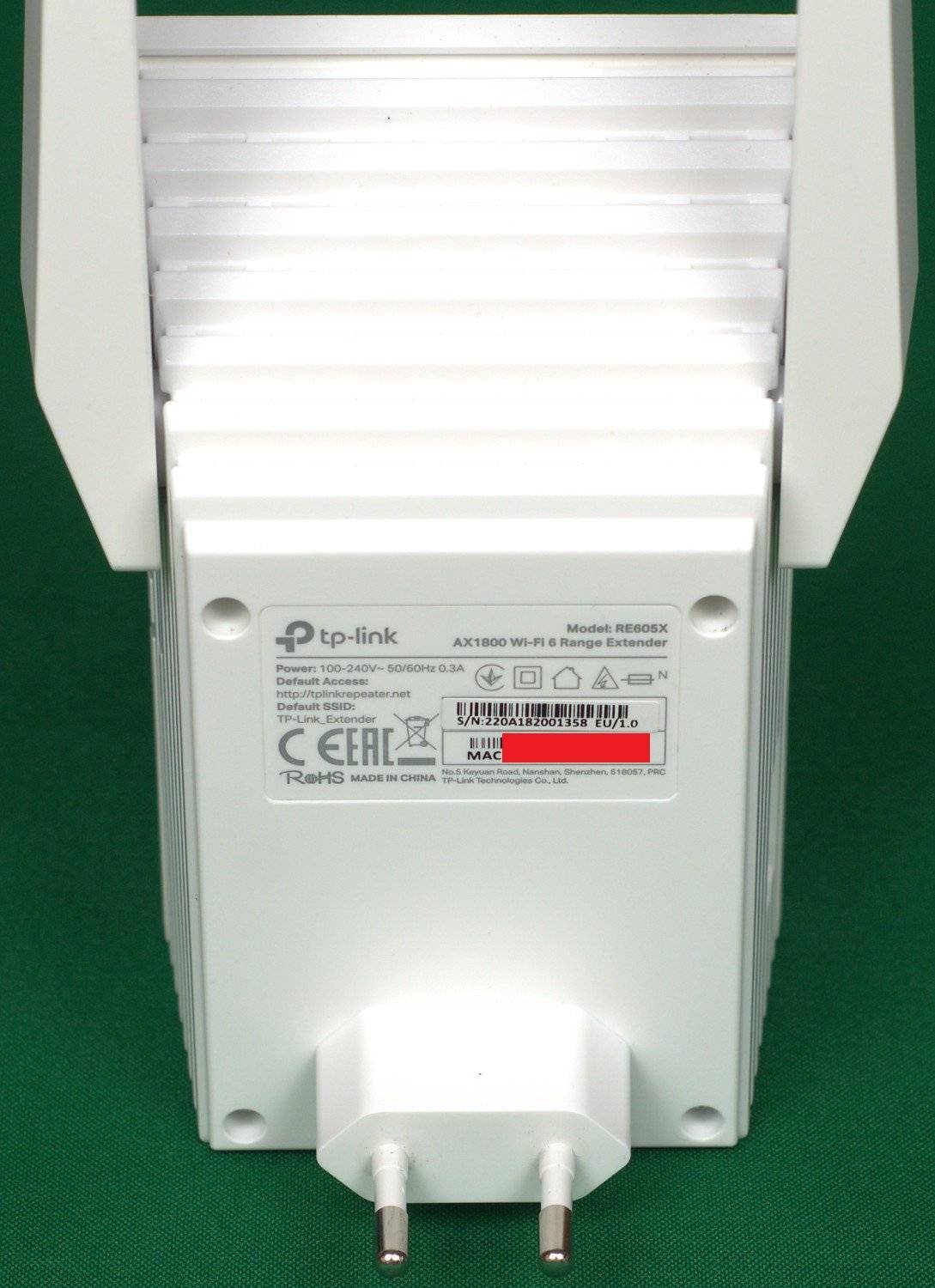С противоположной стороны присутствует наклейка с моделью устройства, серийным номером, MAC-адресом, http-адресом и SSID сети вещания для доступа к настройкам. Он поддерживает технологии приема/передачи нескольких потоков данных MU-MIMO 2×2, направленного луча Beamforming, бесшовное соединение OneMesh.