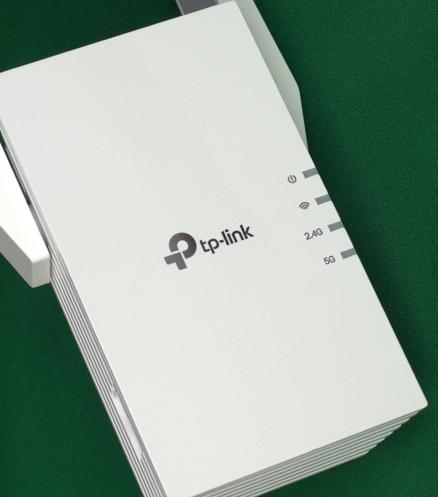 Лицевая сторона имеет глянцевую поверхность и на ней, помимо названия производителя, имеются индикаторы работы усилителя сигнала Wi-Fi 6 TP-Link RE605X: питание, активность Wi-Fi, активность отдельных диапазонов частот 2.4 ГГц и 5 ГГц. Как видим, сквозной ЕВРО-розетки усилитель сигнала не имеет.