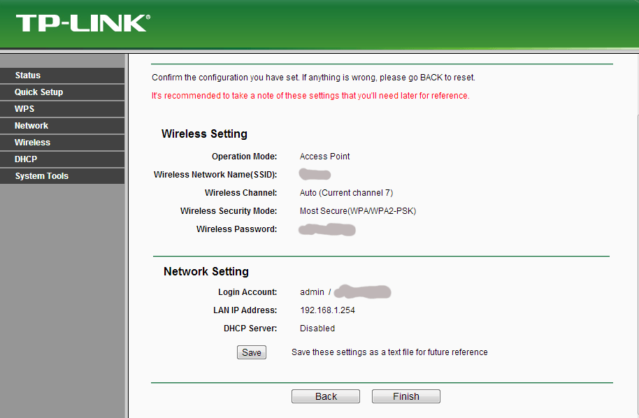 Проверьте все настройки. Если все указано верно, нажмите кнопку Save и сохраните настройки в надежном месте, на случай, если что-то забудете. Нажимаем Finish и ждем, пока модем сохранит свои настройки и перезагрузится.