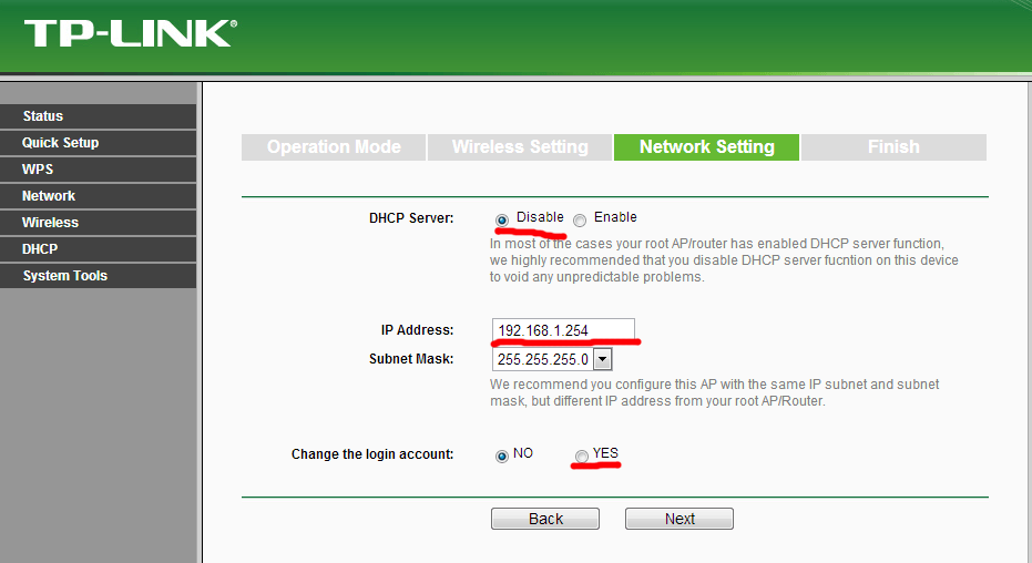 DHCP-сервер должен быть отключен. Так же необходимо, чтобы репитер и основной роутер были в одной подсети. По умолчанию, в настройках указан IP-адрес 192.168.0.254. Если у вашего роутера IP 192.168.0.1 (можно посмотреть на самом роутере) , то менять ничего не нужно. Но, если так как у меня, IP-адрес роутера 192.168.1.1, то «0» меняем на «1».