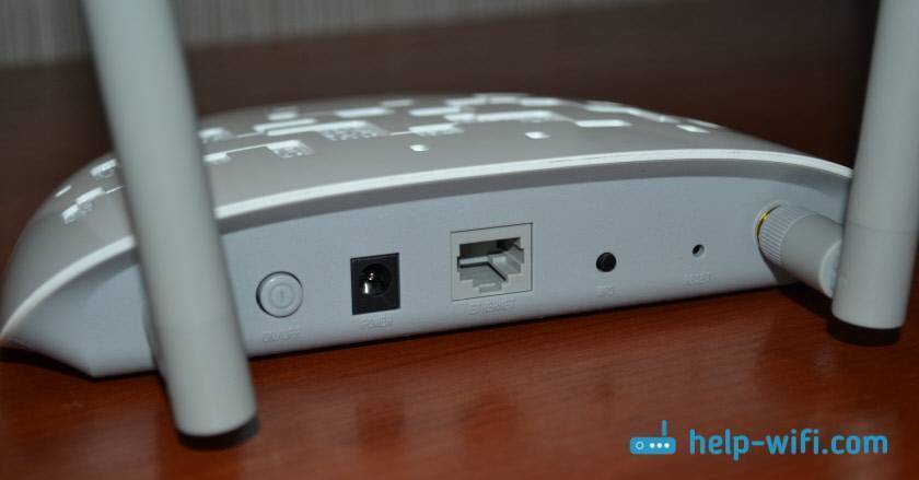 Снизу устройства есть наклейка с заводской информацией. На задней панели крепление для одной, или двух съемных Wi-Fi антенн (в зависимости от модели), 1 порт Ethernet, разъем для подключения питания, кнопка для отключения питания, кнопка WPS и Reset.