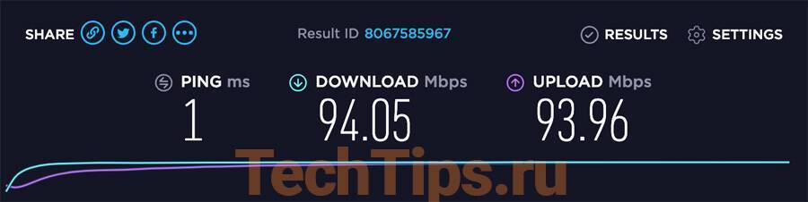 Роутер со своей задачей справился в пределах нормы. По кабелю 94 Мбит/сек. По Wi-Fi на расстоянии 5 метров — 35 Мбит/сек. На расстоянии 15 метров и одной кирпичной стены — 28 Мбит/сек.