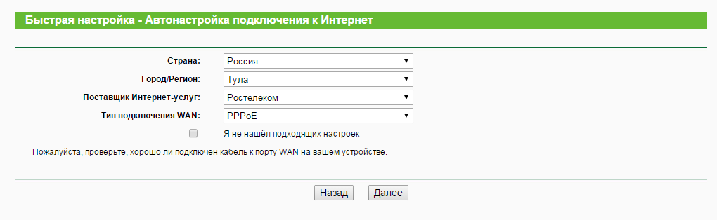 Из выпадающего списка выбираем нашу страну, город, провайдера и тип подключения. Нажимаем “далее”