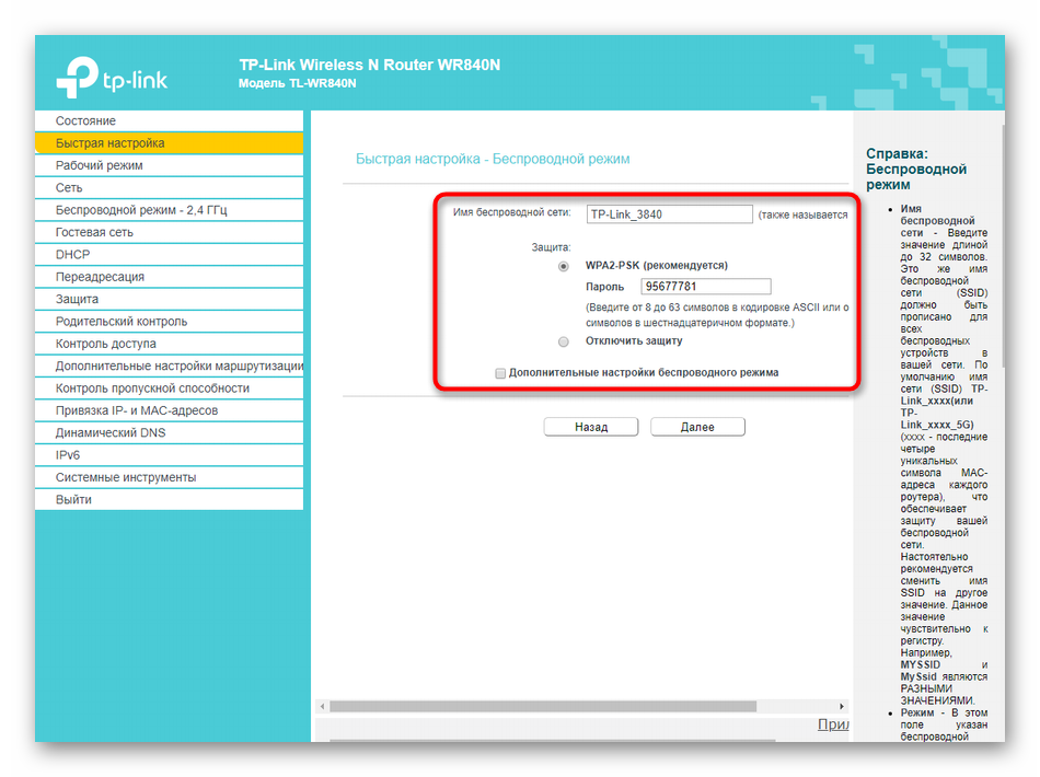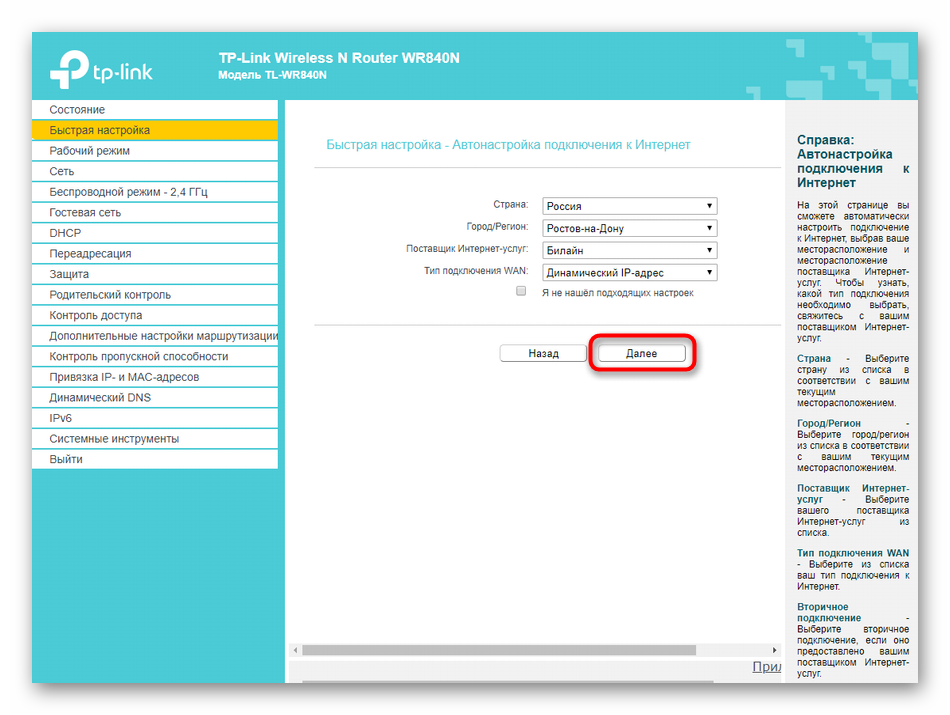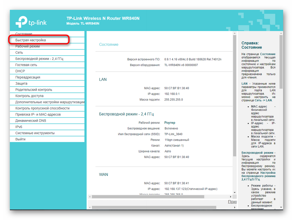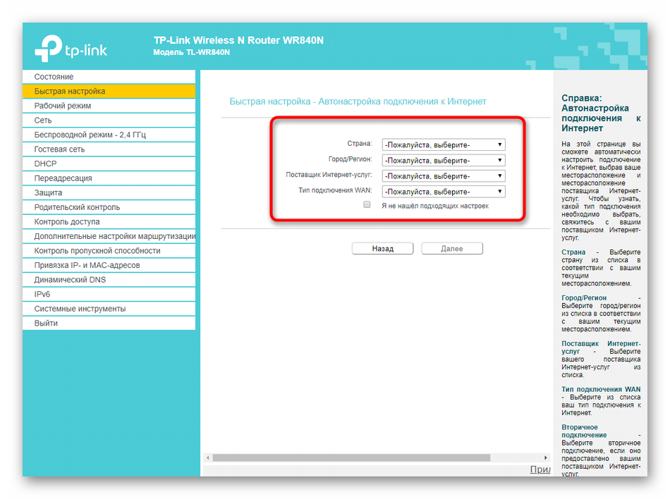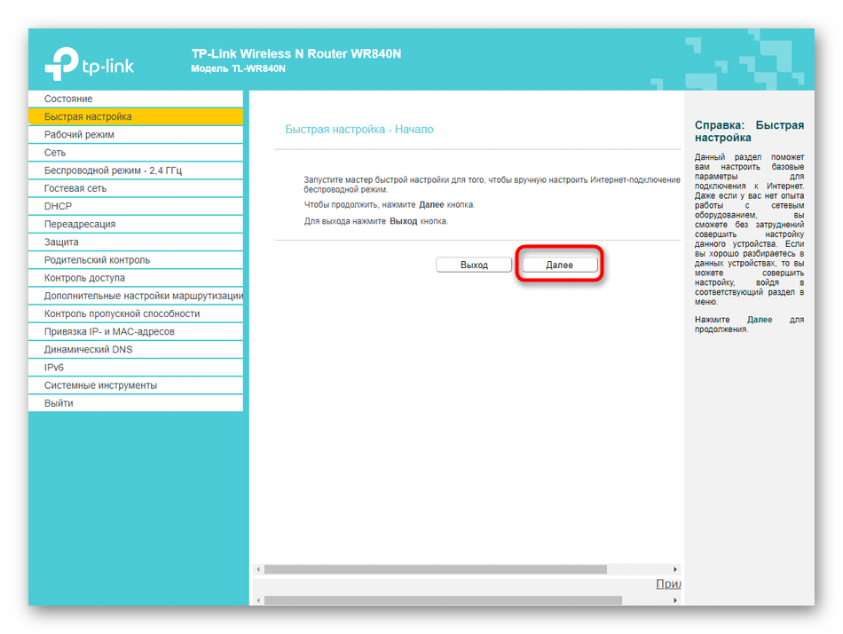 Раздел веб-интерфейса под названием «Быстрая настройка» предназначен для установки конфигурации TP-LINK TL-WR840N в полуавтоматическом режиме, а от пользователя требуется выбирать только самые основные параметры. Большинству подойдет именно такой режим, поэтому давайте рассмотрим каждое действие.