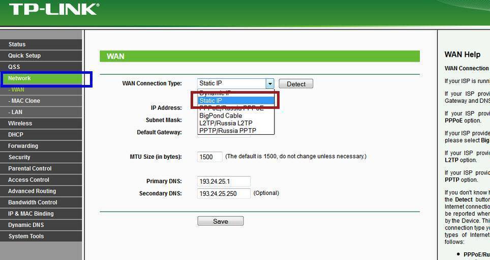 На роутерах TP-LINK, настройки подключения к провайдеру можно изменить на вкладке Network (Сеть) – WAN. Тип подключения выбираем в выпадающем меню WAN Connection Type (Тип подключения WAN). Соответственно, если у нас подключение Динамический IP, то выбираем эту технологию, и сохраняем настройки.
