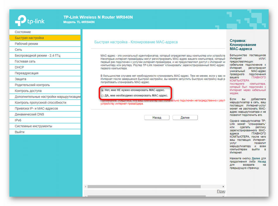В следующем окне Мастер настройки предложит клонировать MAC-адрес. Более детально обо всем этом разработчики TP-Link написали в этом же меню, а потому мы не будем повторяться. Обычному пользователю вряд ли потребуется клонировать MAC-адрес, потому значение оставляется по умолчанию и происходит переход к следующему окну.
