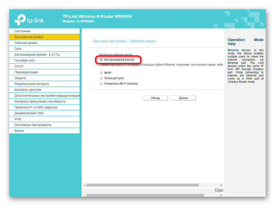 В качестве режима работы выберите «Беспроводной роутер», отметив маркером соответствующий пункт.