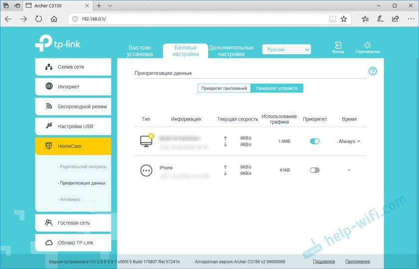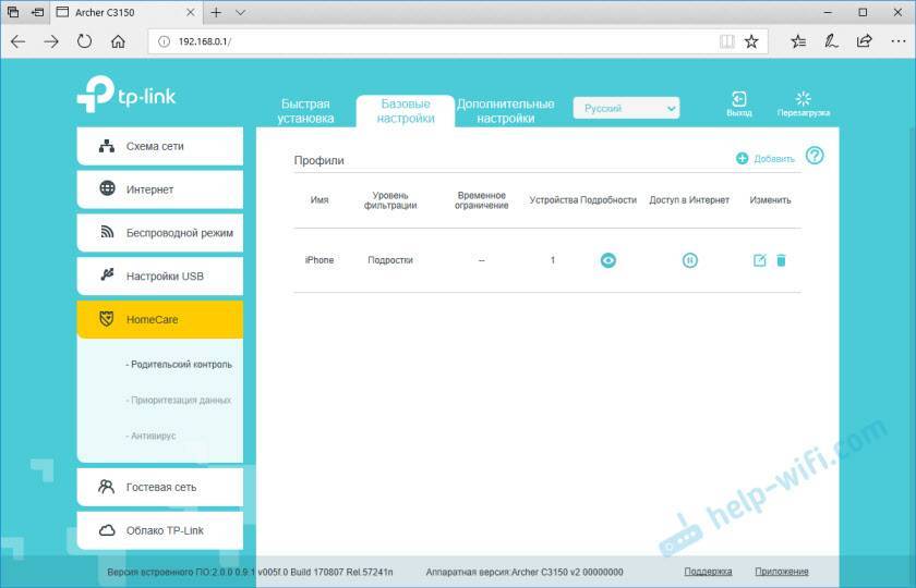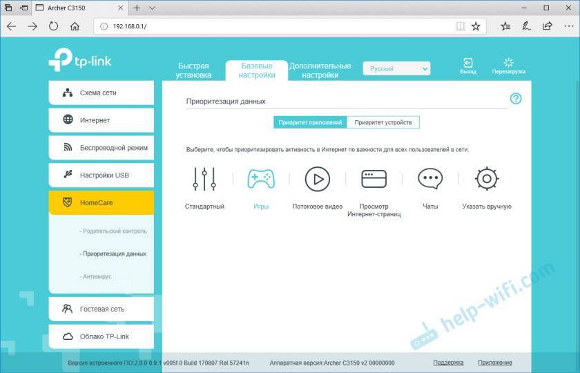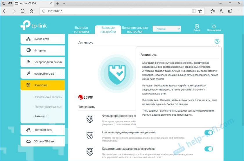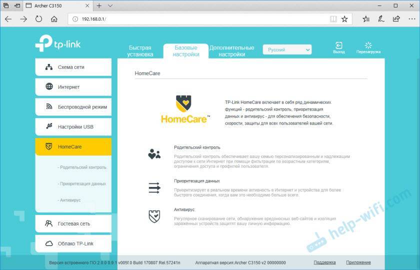 Первое, что бросается в глаза при входе в панель управления TP-Link Archer C3150, это раздел “HomeCare”.