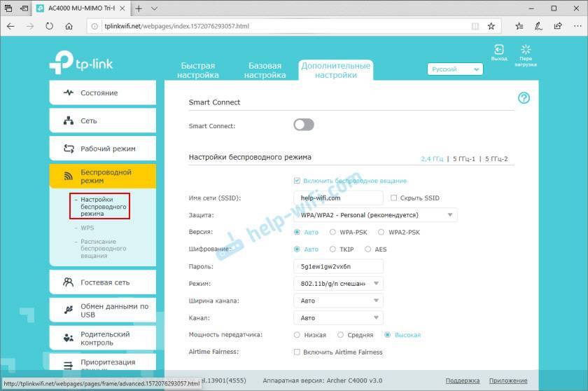 Шаг #3: настройка Wi-Fi сети. Здесь все просто. Меняем имя сети (это по желанию) и пароль (это обязательно) для каждой Wi-Fi сети (диапазона). При необходимости можно отключить Wi-Fi сеть в определенном диапазоне. Пароль можно установить одинаковый для всех диапазонов (сетей).