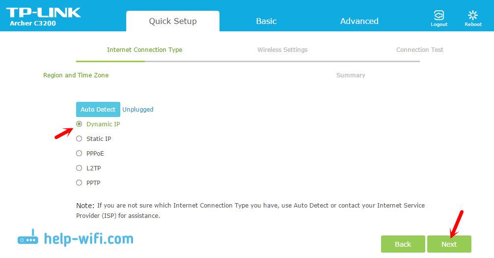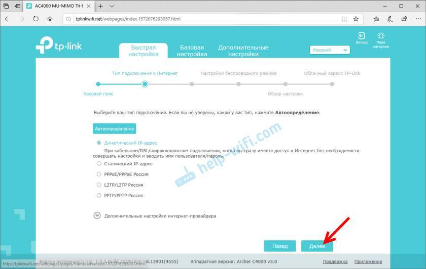 Шаг #2: подключение к интернету. Очень важные параметры, будьте внимательны. Нужно выбрать тип подключения, который использует наш интернет-провайдер. Если задать эти настройки неправильно – роутер не сможет подключиться к интернету. В начале статьи я об этом уже писал. Все параметры можно узнать у поддержки интернет-провайдера. У меня “Динамический IP-адрес”.