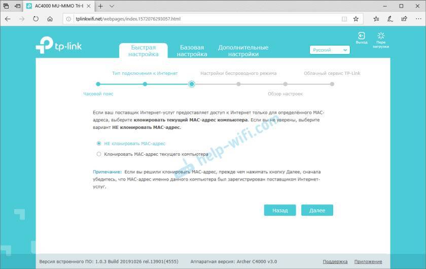 Роутер спросит, делает ли провайдер привязку по MAC-адресу. Если делает (что редко), то нужно клонировать MAC с компьютера, к которому раньше был подключен интернет. Или позвонить в поддержку провайдера, и попросить прописать новый MAC адрес роутера. Он указан снизу устройства.