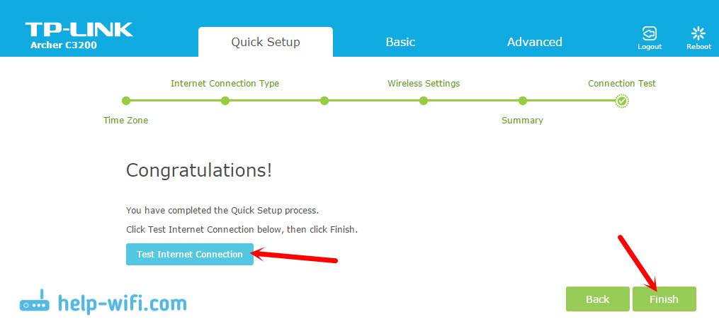 Ждем пока роутер сохранит настройки. Затем, он предложит протестировать подключение к интернету. Нажмите на соответствующую кнопку.