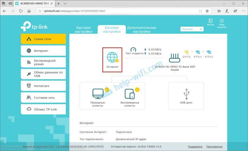 Если роутер сообщит, что подключения к интернету нет, то проверяйте настройки подключения к провайдеру на вкладке “Basic” – “Internet”.