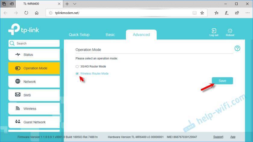Если у вас интернет по кабелю, то в настройках, в разделе “Operation Mode” переводим роутер в режим “Wireless Router Mode”. После сохранения настроек роутер будет перезагружен.
