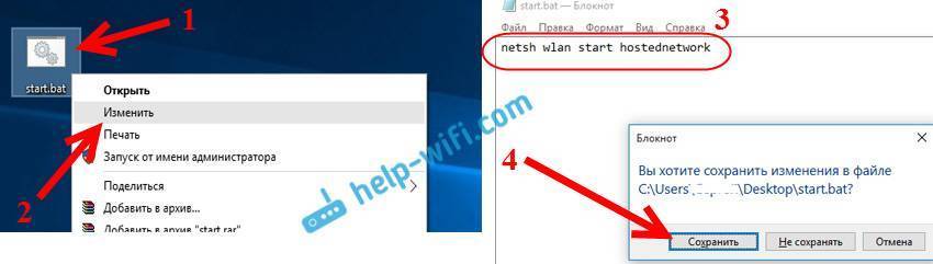 Вот и все, теперь у нас есть файл start.bat, нажав на который (двойной клик) , сразу запустится раздача Wi-Fi. Точно таким же способом можно создать файл для остановки сети. Назовите файл например stop.bat, и вставьте в него команду “netsh wlan stop hostednetwork”. После запуска этого файла, виртуальная сеть будет остановлена.