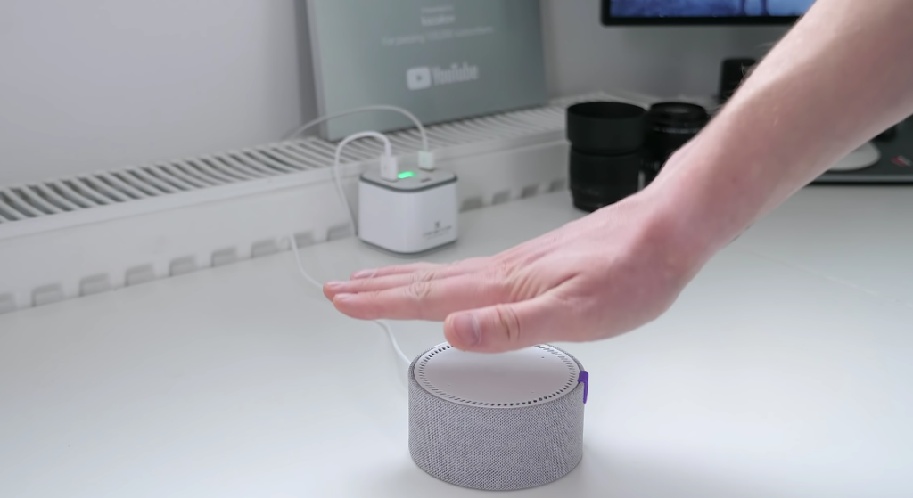 А вот сама громкость управляется жестами, чего не было в большой Яндекс Станции, которая появилась на рынке немного ранее. Это стало возможным благодаря расположенному здесь же рядом датчику приближения, который реагирует на поднесенную к нему руку. Отводим ее дальше — звук прибавляется, ближе — уменьшается. Кстати, у этого сенсора есть и еще одна прикольная функция — можно попросить Алису имитировать звуки музыкальных инструментов и с помощью руки на них как бы поиграть.