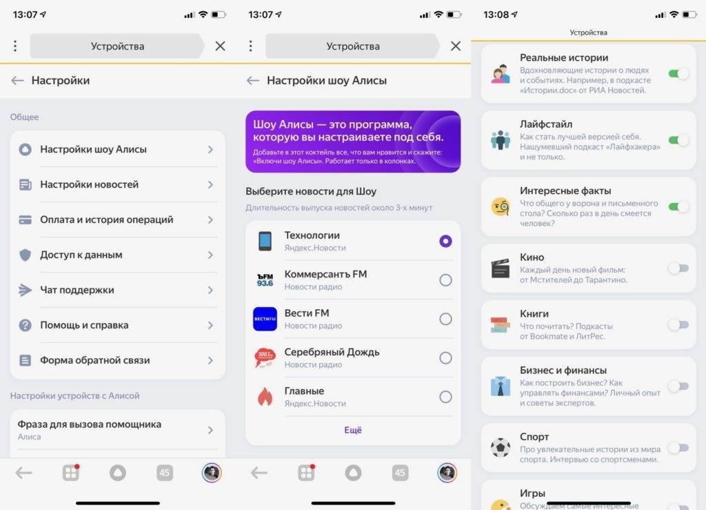 На мой взгляд, недооцененная штука. С помощью «шоу» можно начать свой день и приступить к работе под ненавязчивый рассказ «Алисы» и любимые композиции. «Утреннее шоу» можно настроить под себя — для этого нужно открыть приложение «Яндекса», зайти в «Устройства» → «Настройки» → «Настройки шоу Алисы». Затем выбираем рубрику, которая вам интересна, и сегменты шоу.