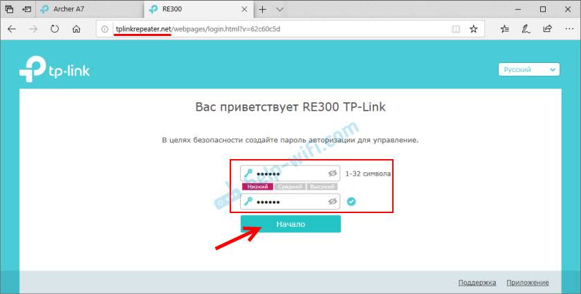 Дальше открываем любой браузер и переходим по адресу tplinkrepeater.net (подробнее в этой статье). Репитер предлагает нам задать пароль администратора (для защиты страницы с настройками). Придумываем, задаем его и продолжаем.