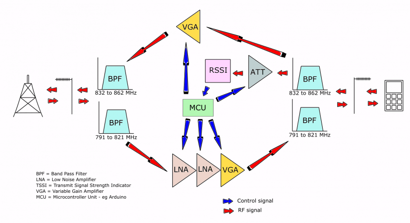 Разные системы усилителей связи работают по одному и тому же принципу: принимают слабый сигнал, усиливают и ретранслируют его в помещении. Комплект оборудования представляет собой устройство с двумя антеннами (внешней и внутренней), соединяющим кабелем и блоком питания.
