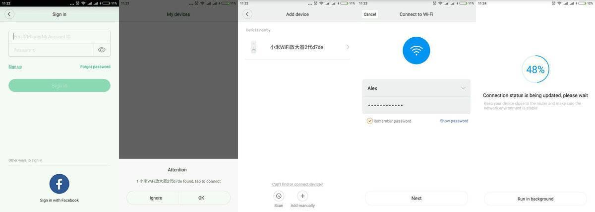 Подключение и все настройки устройства осуществляются посредством фирменного мобильного приложения. Для его установки на упаковке с Xiaomi Mi WiFi Amplifier 2 напечатан специальный QR-код. Чтобы приложение нашло усилитель, его достаточно включить или перезагрузить. После этого можно выбирать сеть Wi-Fi и подключаться к ней.