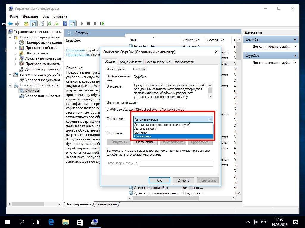 Два раза нажимаем по ней и в появившемся окне в строке «Тип запуска» задаем «Отключена» / потом «Применить» или «ОК».