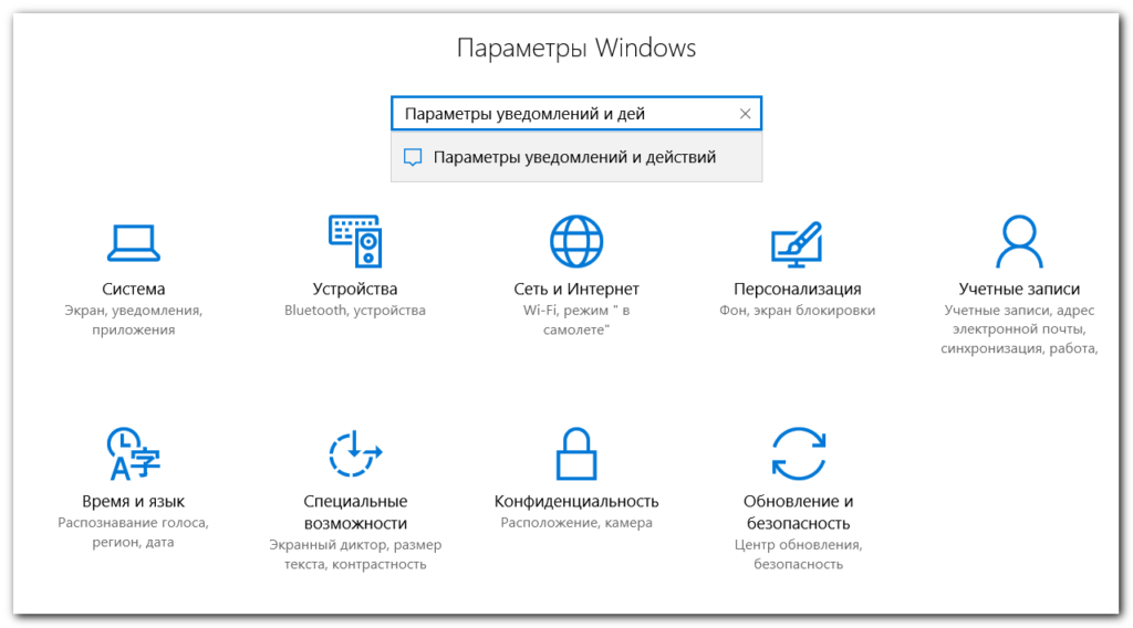 Если принимается решение повысить быстродействие за счет отключения подсказок, следует найти основное системное меню, раздел «Уведомления и действия».