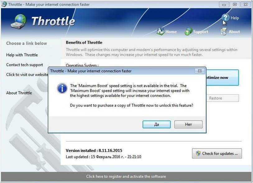 Позволяет произвести настройку опций сетевого подключения для достижения наилучшего быстродействия, что приводит к повышению скорости соединения примерно в 2 раза. Главная особенность Throttle проявляется в обеспечении расширения возможности текущего сетевого соединения. Для этого используется одноразовая настройка, за счёт задействования не всегда задокументированных особенностей ОС. Кроме этого утилита не внедряет добавочных служб в отличие от аналогичного ПО.