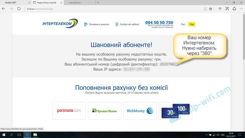 Появится сообщение, что нужно пополнить счет. Откроется страница, на которой нужно выбрать один из предложенных вариантов, и пополнить счет. Там же будет указан ваш номер Интертелеком, который нужно использовать при пополнении. Только указывать его нужно с «380».