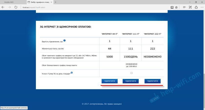 Выбираем для себя тариф. С оплатой по факту использования, или с помесячной оплатой. Я выбрал пока что самый простой тариф – «Интернет 44»