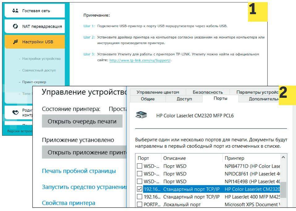 Для открытия доступа к принтеру из домашней сети подключите его по USB к роутеру (в нашем примере TP-Link Archer C9) (1). Затем в настройках принтера в Windows (2) выберите подключение TCP/IP