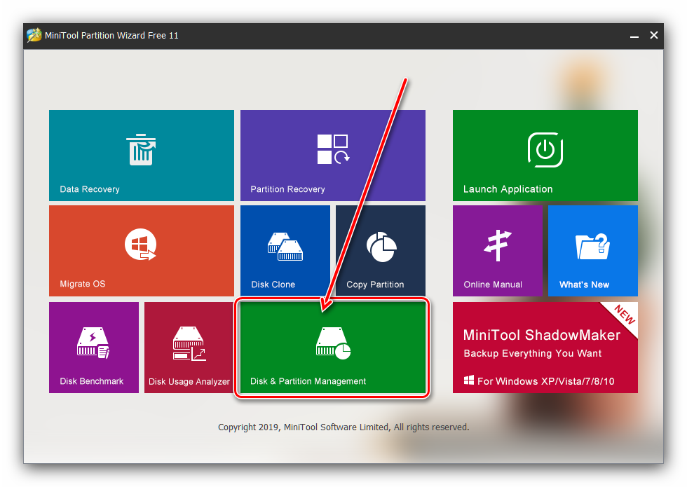 - Установите ПО и запустите его. Кликните по плитке «Disk & Partition Management».